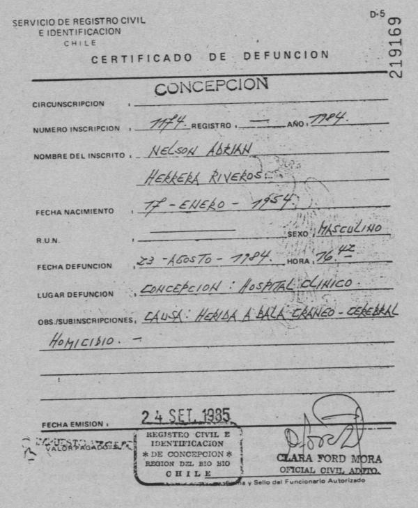 Los protocolos de autopsia y los certificados médicos de defunción (1) coinciden en señalar como causa de muerte de Luciano Aedo, Mario Lagos y Nelson Herrera, heridas a balas producidas por armas homicidas. Nelson Herrera y Mario Lagos fueron asesinados en plena luz del día frente a la Vega Monumental ante cientos de testigos. El chofer del taxibús donde viajaban relató que ellos fueron asesinados y que no hubo enfrentamiento de ningún tipo. Todos estos antecedentes constan en el expediente Nº 745- 84. Sin embargo el fiscal Ad-Hoc Pedro Marisio no ha dictado ninguna resolución que afecte a los homicidas.