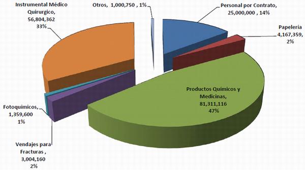 En cuanto al tema del financiamiento que requiere la nueva administración del Hospital, para solventar el desabastecimiento de los almacenes y mantener personal especializado en áreas sensible hasta fin de año, se ha formulado el presupuesto siguiente, el cual asciendo a L. 172,647,347 y se desagrega en el gráfico N. 12: