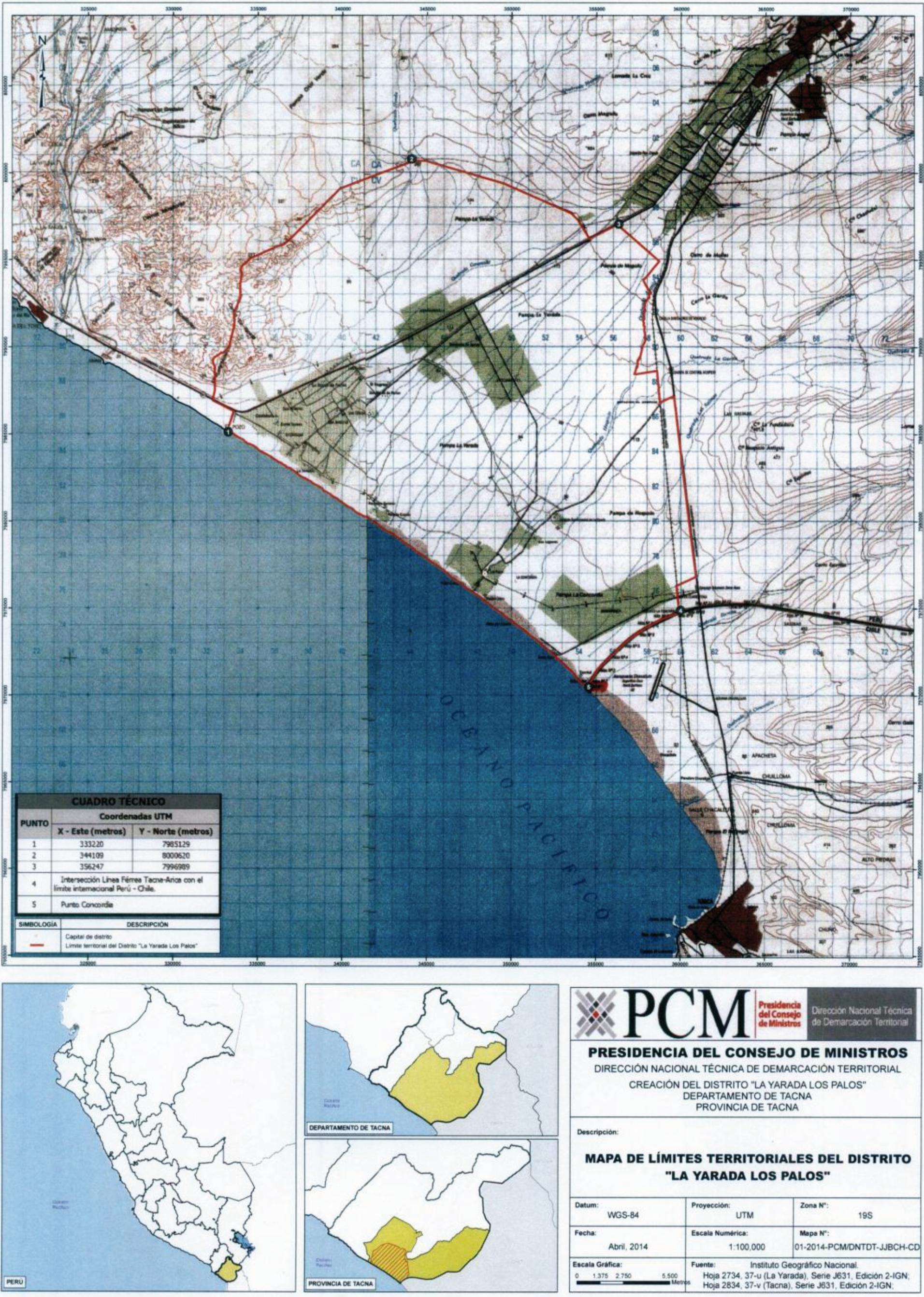 POR EL OESTEPartiendo desde el punto Concordia, punto de inicio de la frontera terrestre con la República de Chile, limita con el océano Pacífico, siguiendo la línea de baja marea hasta un punto de coordenada UTM 333 220 m E y 7 985 129 m N, punto de inicio de la presente descripción. Todo ello, igualmente, con respeto al límite marítimo con Chile definido por el fallo de la Corte Internacional de Justicia del 27 de enero de 2014 y a las coordenadas determinadas en virtud de los trabajos realizados por técnicos de ambos países que constan en el Acta firmada en Lima, el 25 de marzo de 2014.