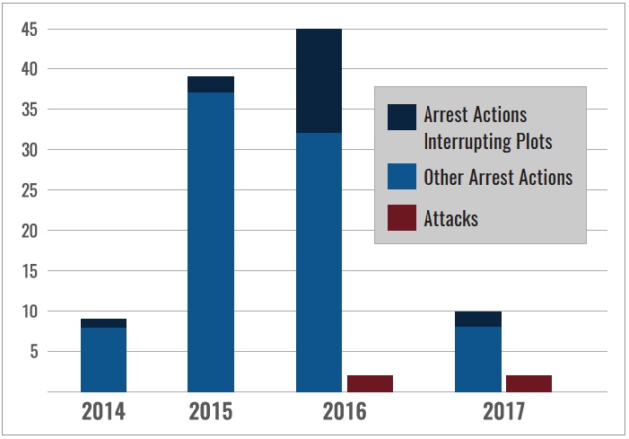 • Seventeen percent of all arrest actions revealed evidence of a plot, which suggests that those arrested were serious in their intent to conduct an operation.